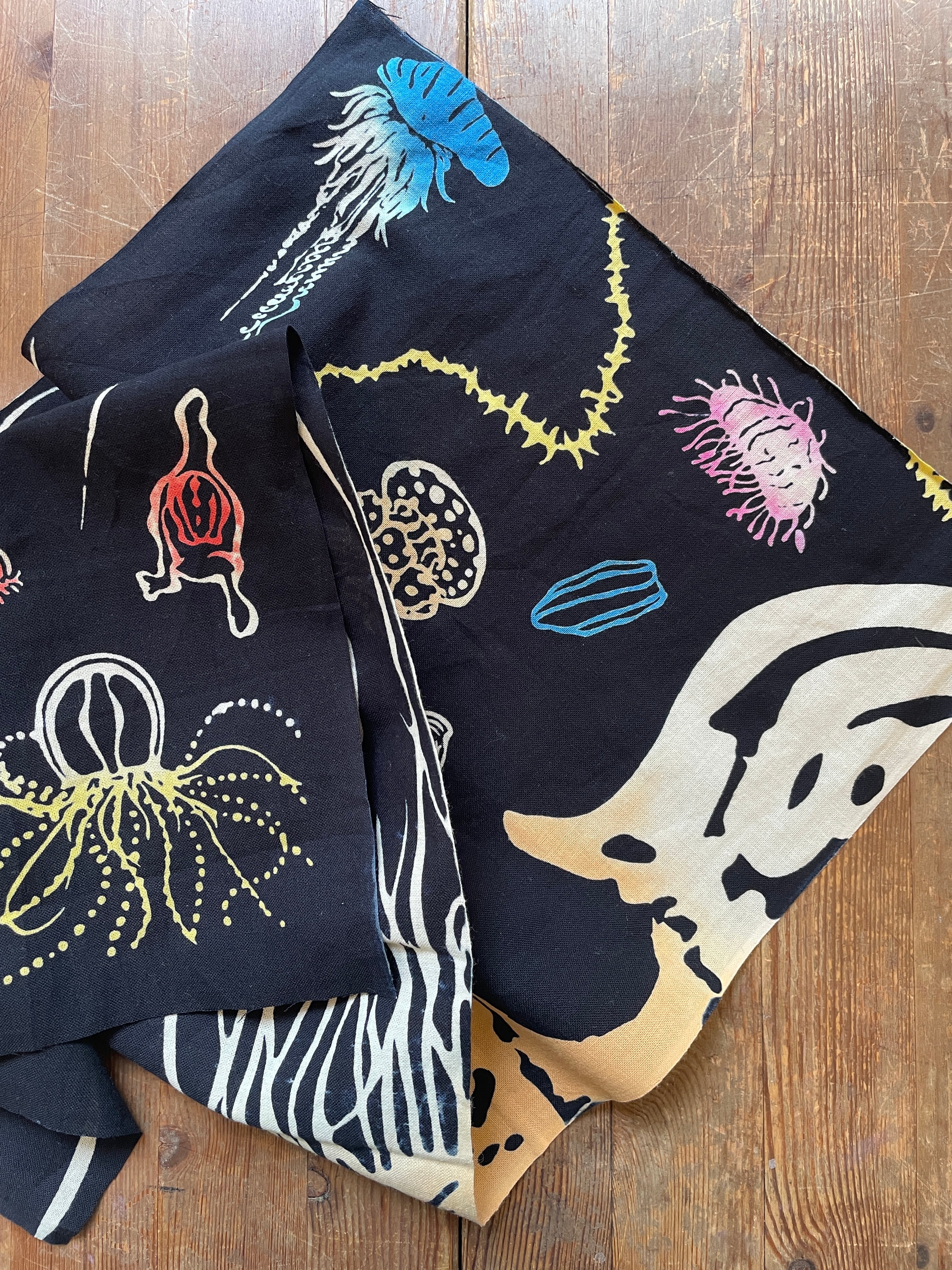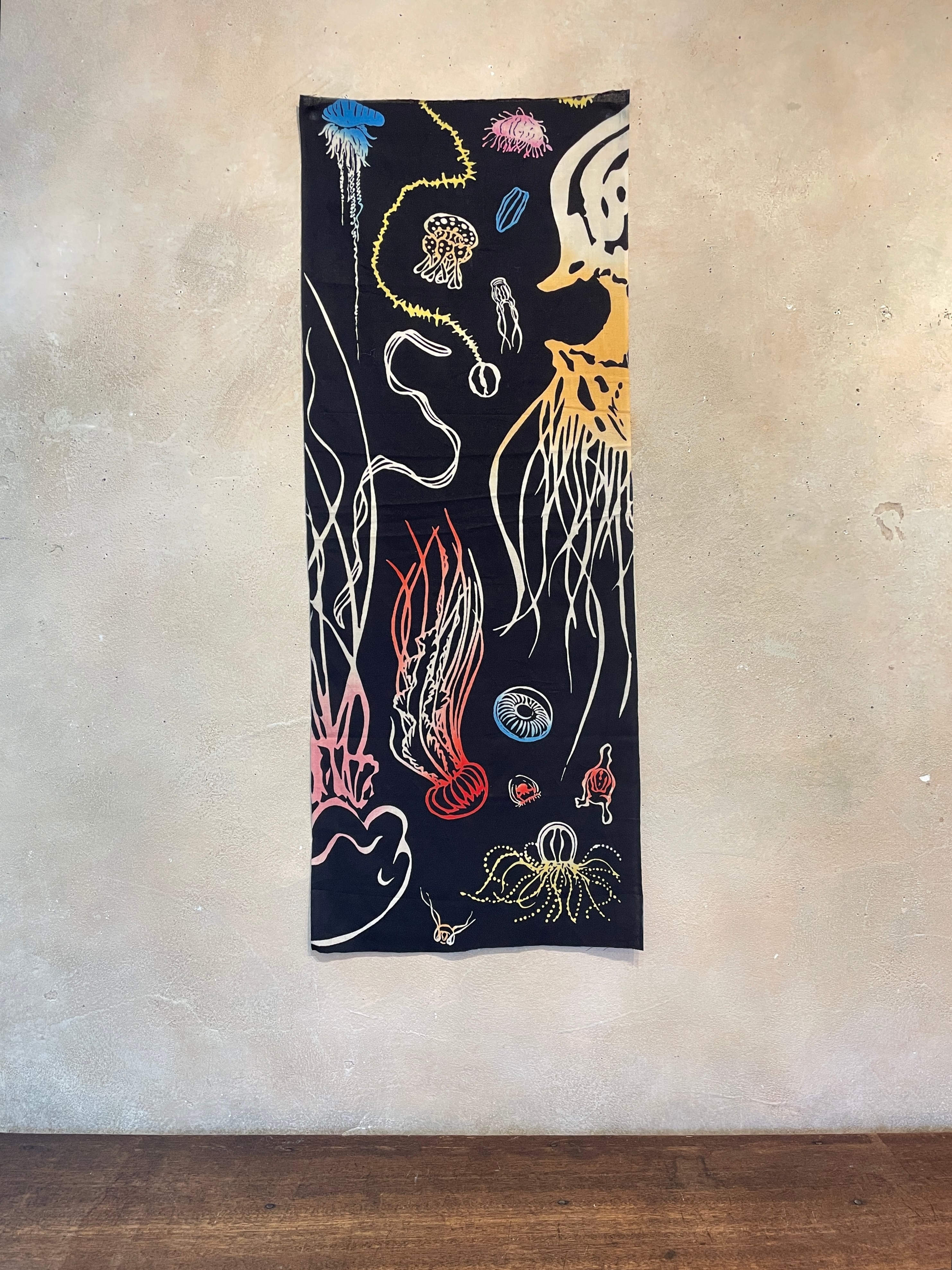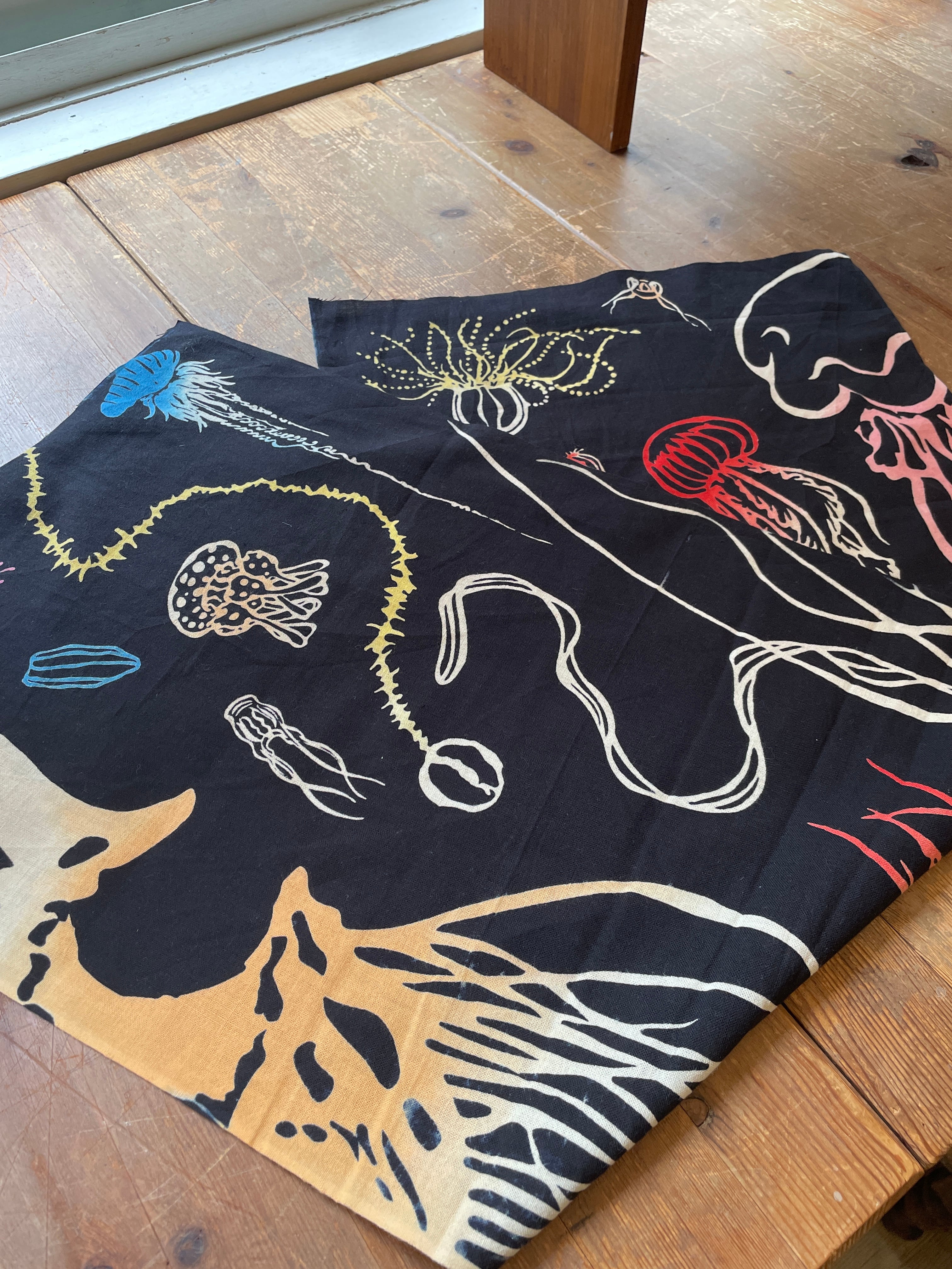 きのこ尽くしはじめ、黒地の手ぬぐいが代表作となっているplay on wordsとしてはヒヤヒヤの時期でしたが、この朗報を受けて、安心して新作のクラゲ尽くしもお願いすることができたのでした。