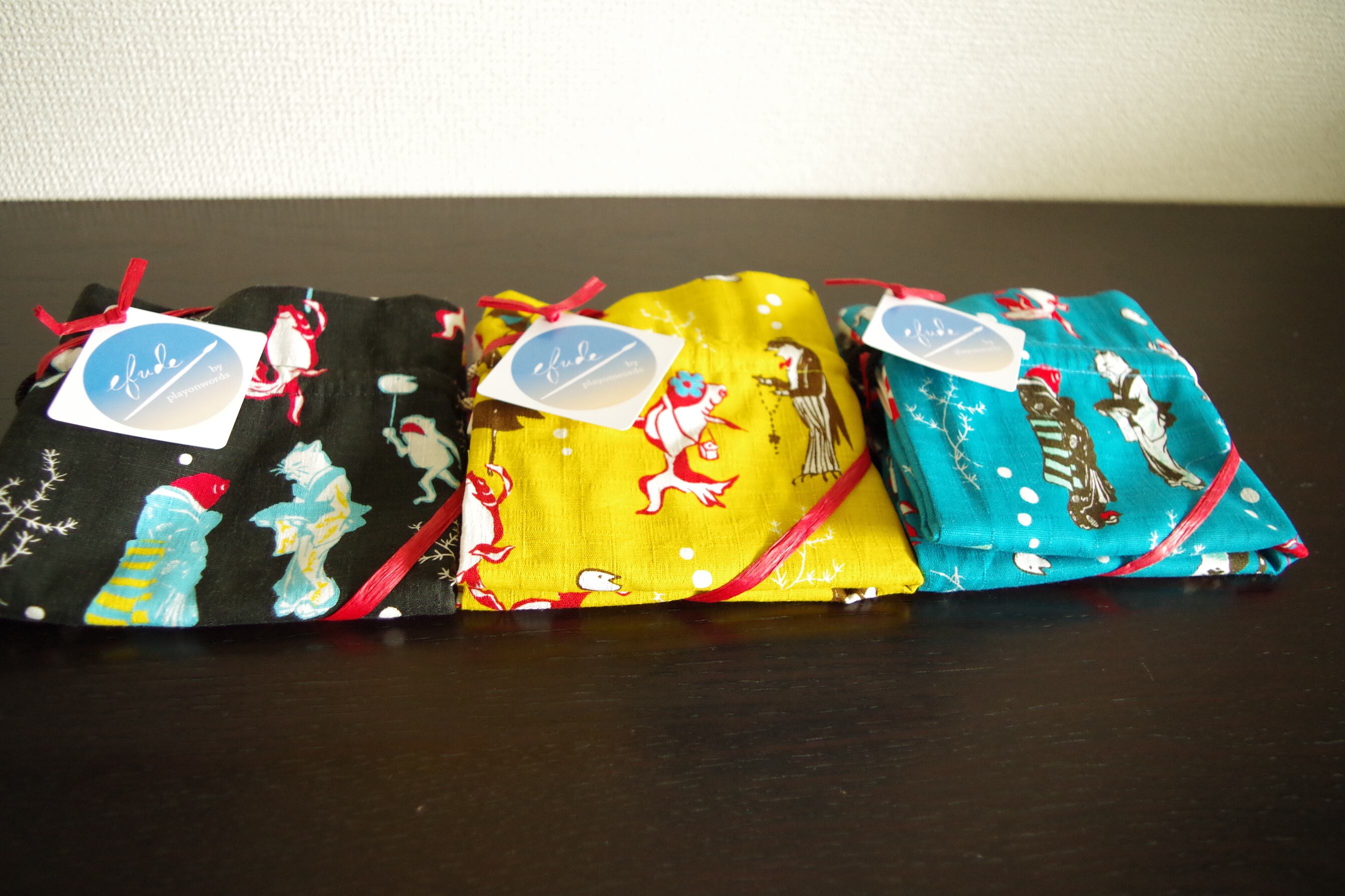 注染手ぬぐいでは表現出来なかった、パキッとした地色とカラフルな色使いが魅力のこちら。どこの部分を切り取っても、愛嬌のある金魚とお買い物先の動物の店員さんが現れて、絵巻物のように楽しいデザインです。