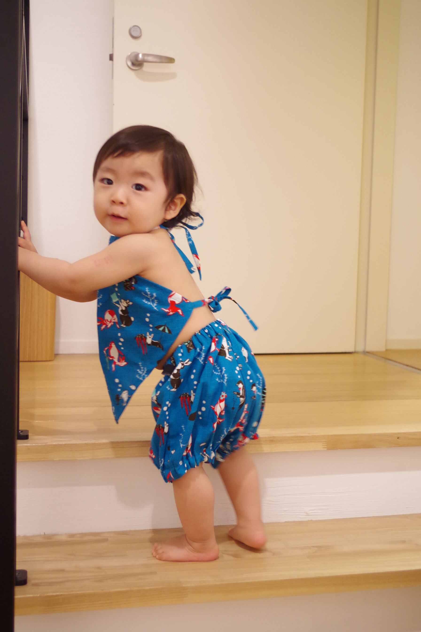 生まれたばかりの赤ちゃんには大きめですが、1歳前後から2−3年ほど、長くお召しいただけます。