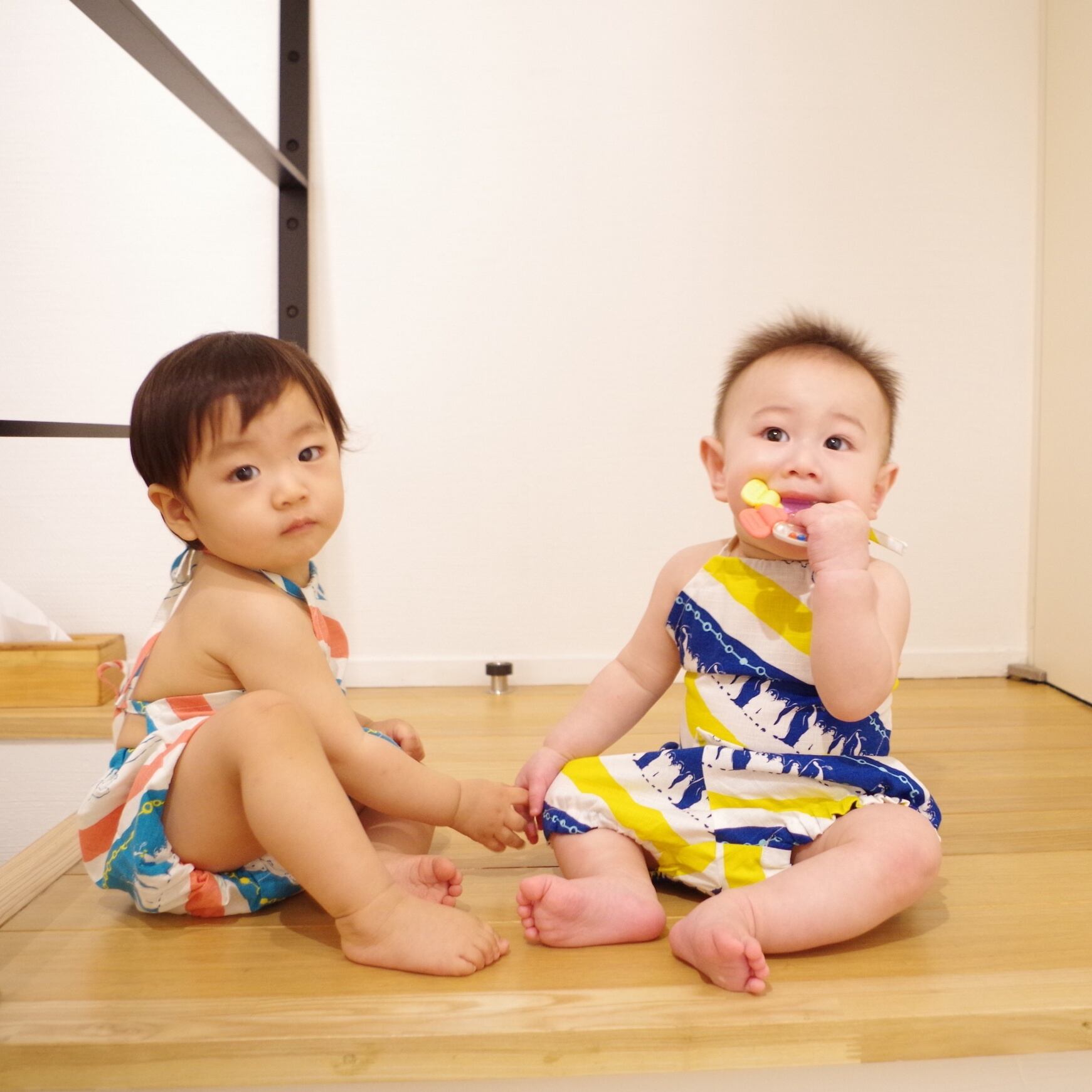 (写真のベビーモデルの月齢は、立っている坊やは1歳、哺乳瓶を抱えている坊やは10ヶ月です)