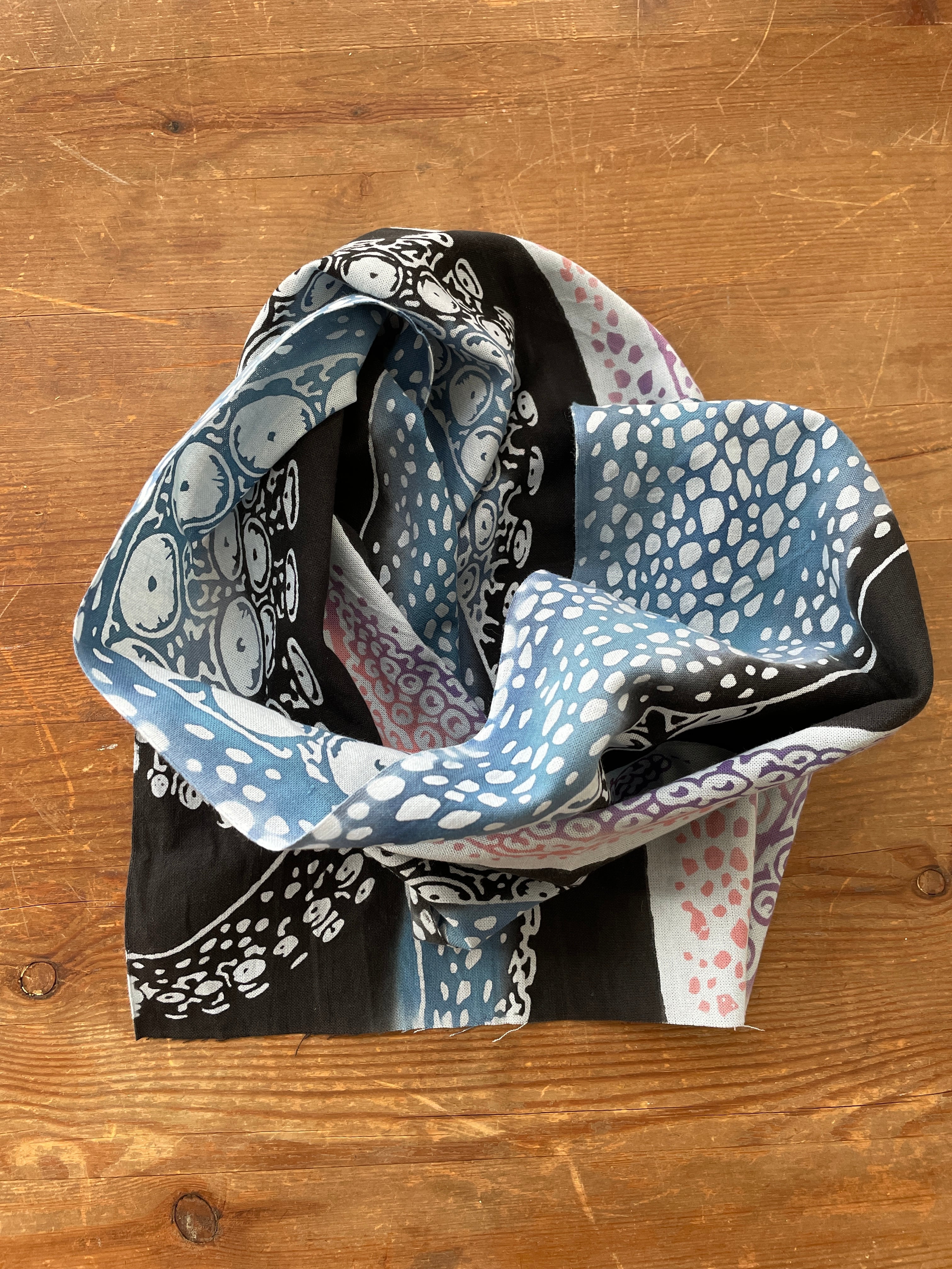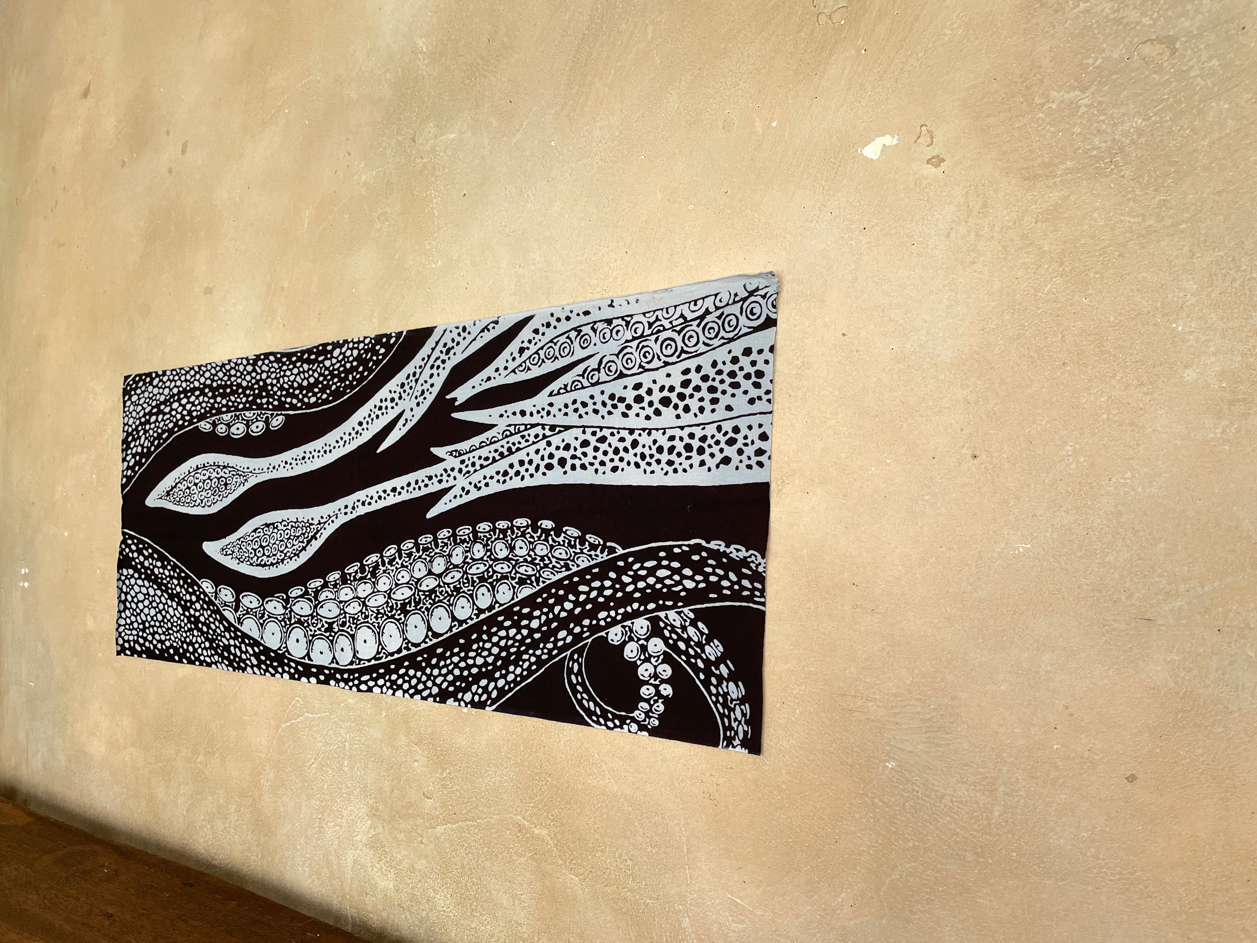 注染ならではの制約と技法の可能性の両方を念頭に置きつつ提案いただいたのは、なんとも大胆に、画面いっぱいに配した「イカとタコの腕」!