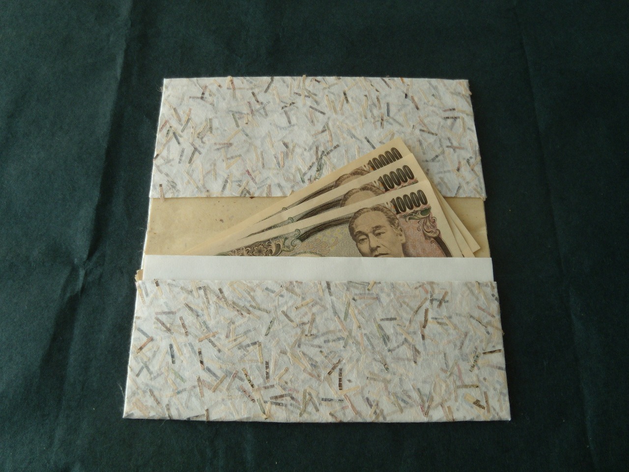 リサイクル紙幣をたっぷり漉きこんだ和紙に包まれて、これならお金も寂しくありません。
