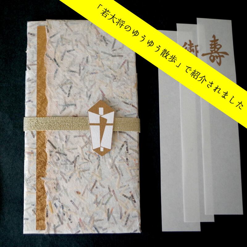 中には万券袋(無地の白封筒)と「寿」「御祝」そして無地の短冊をセットにしました。